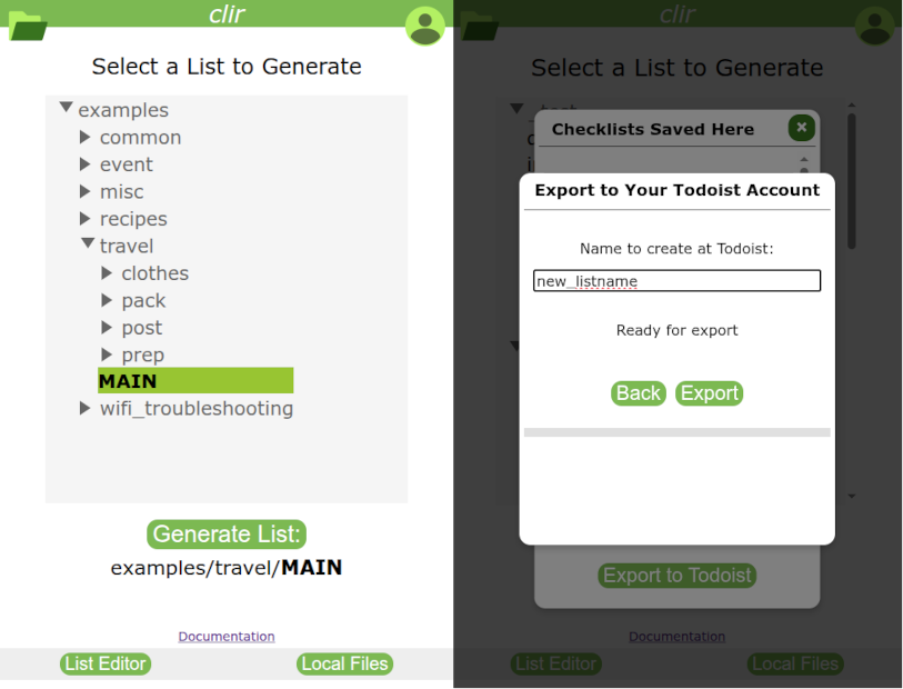 In the pop-up dialog window, select the list that was just generated (it will be at the top of the list), and click “Export to Todoist”. A new pop-up dialog appears. The checklist's generated name is shown, and can be changed to anything you want. This is how the list will be named in Todoist. Click “Export”, then wait for the “Export complete” message. Click “Back” to exit.