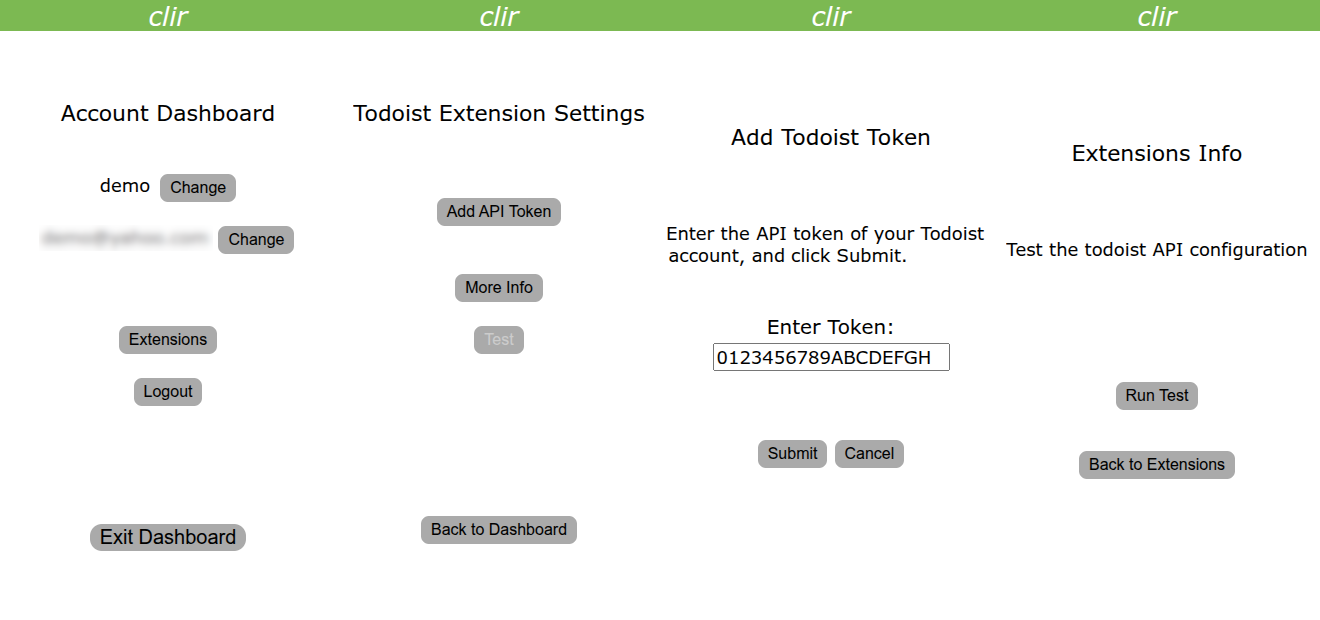 Once you have the token, you can enter it in your clir account by navigating to the account dashboard, clicking “Extensions”, then clicking “Add API Token”. After clicking “Submit”, go back to Todoist Extension Settings and click “Test”, then “Run Test”. The message will indicate whether or not clir successfully connected to your account.